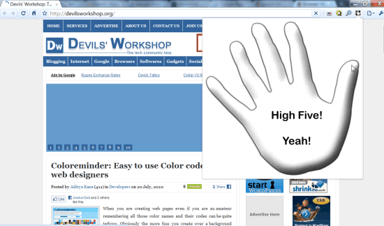 This Chrome extension called High Five does just that and displays a large ‘High Five’ on your Chrome browser. It really does nothing except I find it fun to have my browser give me a high five after writing a nice post. πŸ˜›