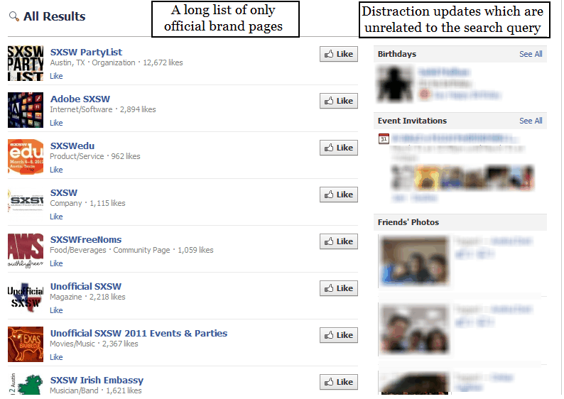 Facebook display search results pushing brand pages. The posts do not show up in real-time and there is also distraction with unwanted information on the right hand column showing birthdays and photos shared long ago by friends. These things have nothing to do with the query I was searching.