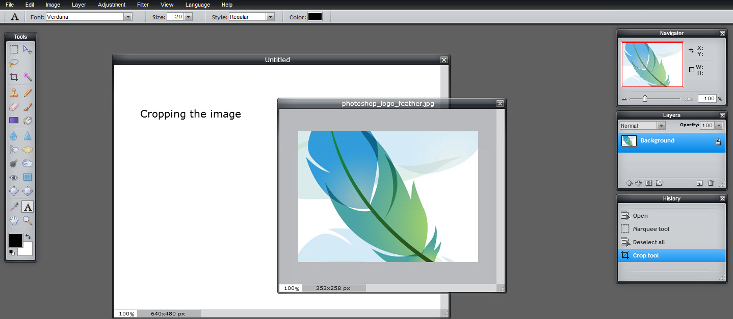 Pixlr is a free online photo editor. Manage your images in your browser, Edit, adjust and filter your images. No registration needed, its absolutely free. View the direct application here.