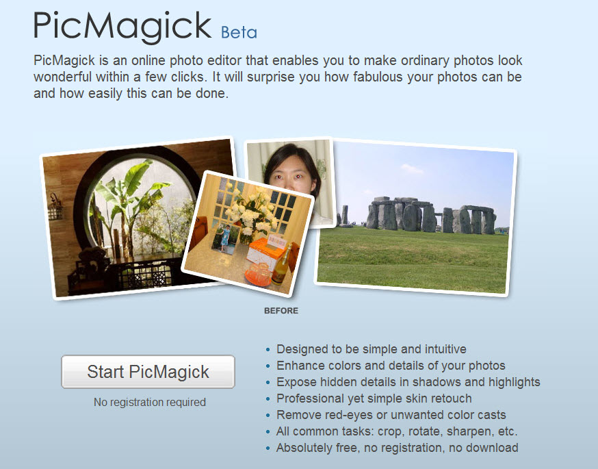 PicMagick is an online photo editor that enables you to make ordinary photos look wonderful within a few clicks. It will surprise you how fabulous your photos can be and how easily this can be done. View the direct application here.