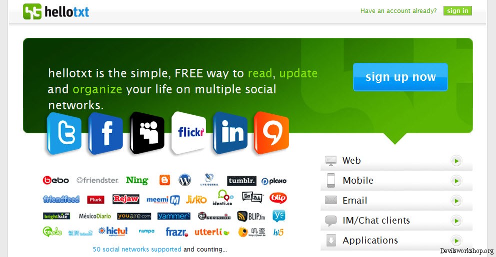 Hello Txt is a Status Manager that which enables your status updates across all of your Social Networks and Microblogs with just a single click. So your status messages will be updates to various services like Facebook, Twitter, Myspace, etc. <link>