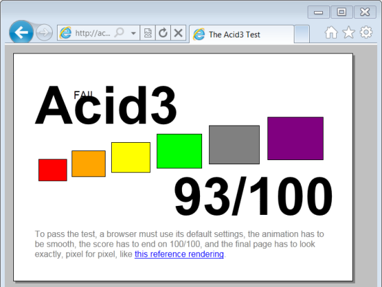 IE9 stills scored 93/100 but did much better than its predecessor. IE8 would get stuck at a lowly 60/100 when I tested that browser last year. It seems to have improved its performance by lot with IE9.