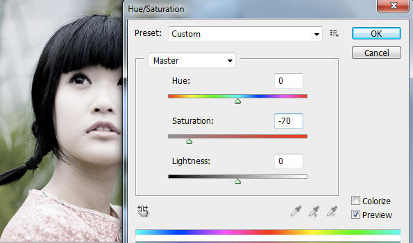 Step 2: Make sure the image layer is selected. Next, go to Image > Adjustments > Hue/saturation. Set the Hue to 0Saturation to –70, and lightness to 0