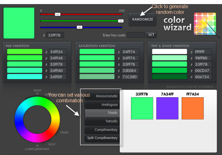 Color Wizard : Choose a color randomly or manually, after that you can set various combination like Monochromatic, Analogous, Triadic, Tetradic etc. As shown in the image when you select any pattern it appears in the corner of the right-bottom.