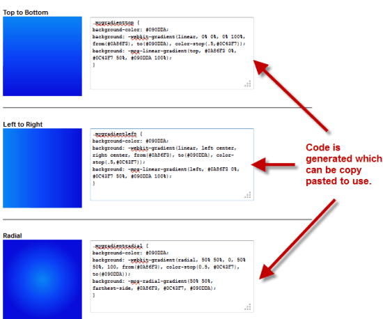 - The results are in three parts. We get the visual representation of the 3 color gradient with like Top to bottom, Left to right and Radial. It also has the code which can be used by copy-pasting it. 😉