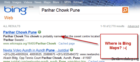 - Bing Maps is similar to Google Maps but here Bing Maps is not integrated with its search results and that I feel is disappointing. Also the links in Bing show everything except a link to its Maps section which I find strange.