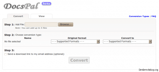 DocsPal is a free online file converter and viewer that supports a variety of image formats, documents formats including achieves, PDF, PowerPoint, Doc, Docx, Xls, open office documents and many other file formats to be converted from one format to other. With no registration required at any point, the conversion is a three-step simple process.