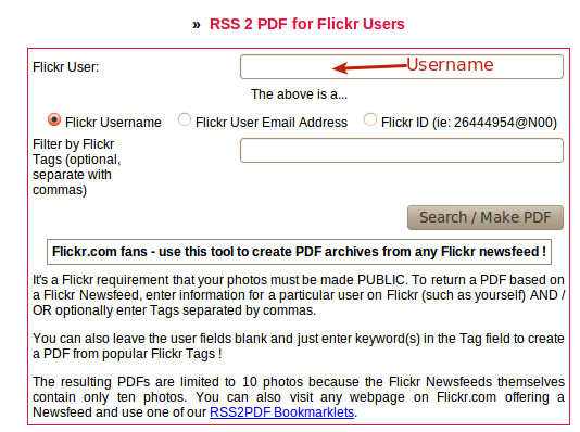 • Go toΒ  http://rss2pdf.com/flickr/ where you can find the tool.