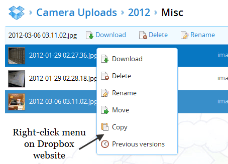 Some notable changes on the Dropbox website are also that it now allows right-click to open a menu. This allows easy options to copy, move or download files or even check previous versions.