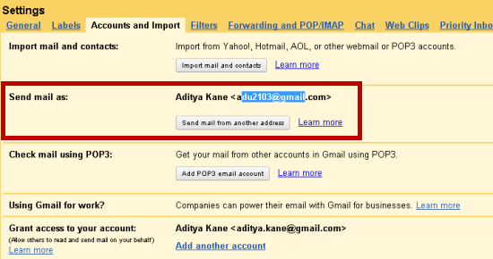 • Let say you have a particular Gmail account you want to delegate. Just look up under Settings >> Accounts and Imports. Here enter the email address you want to grant access.  We can also specify “Send mail as:” under settings as seen in image below.