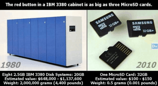 - On the right in present day, one MicroSD Card can store 32 GB memory alone with a value of just over $100 USD with a weight of 0.5 grams. The size of this card is about the size of the red button IBM Disk Systems would have to start it up. 😛