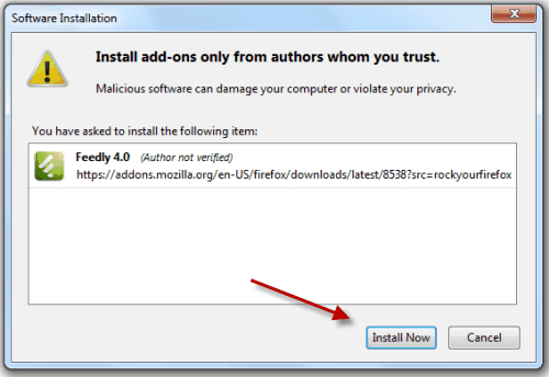 - Download the Feedly add-on from here. After the pop-up opens, click Install Now. Restart your Firefox Browser.