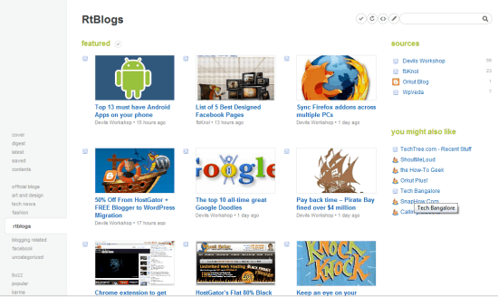 Feedly is a Firefox add-on which displays all your subscriptions in a magazine-like layout. You need to activate this add-on with your Google account, following which it automatically loads in all your Reader settings on one page. With neat tabs, and predefined groups that you may have created on Google Reader.