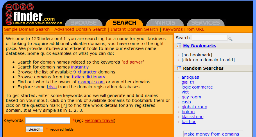 123finder : You are allowed to search and browse for your prescribed domain name from the database by length, thesaurus and also other tools. It provides the thesaurus that which helps you to find the meanings of the new words that might help you to improve the standard of your domain name.