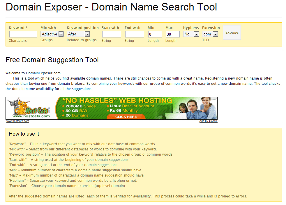 Domain Exposer : This tool is required for you to find the domain names. This one just gives you the unique options as well as usable options. Give your prescribed keywords, then you have to select from their list with many adjectives, nouns, computer terms etc that which gives you the available output.