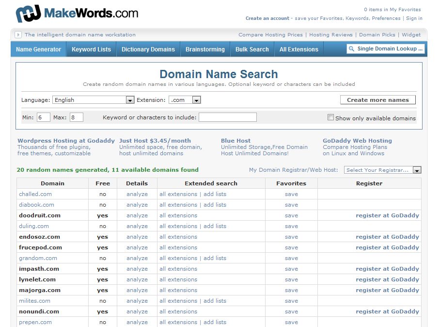 Make Words : This is a brainstorming tool that help us to find most unique available domain names. You can search results based on Random Domain name generator, keyword list, Dictionary domains, synonyms. Its the smart intelligent domain naming workshop tool that displays the results in a very short time. You can also create domain names in various languages.