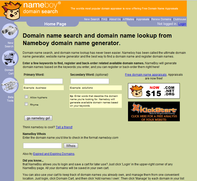 Nameboy : Nameboy is the most intelligent and best online Domain name generator tool website. With this we can generate a new domain name, search for existing domain names, domain name lookups.