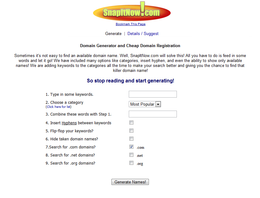 Snap It Now : Its a domain name generator and cheap domain registration. This is one of the best domain naming tool that through which you can find the killer domain names. Its available with many of the options like categories, insert, hyphen and even the ability to only the available domain names.