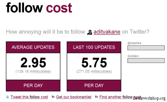 • Follow Cost calculates and displays the number of Tweets per day on an average and also displays the number of Tweets per day for the last 100 Tweets.