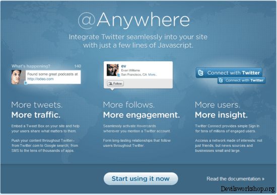A few days ago I wrote about @anywhere feature of Twitter which will revolutionize Twitter usage for websites. This is actually a development forum launched by Twitter which anyone with a Twitter account to create and register a Twitter API.