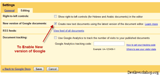 - Now as seen in image below check New version of Google documents and then Save the settings.