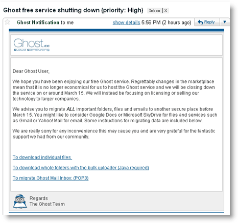 We hope you have been enjoying our free Ghost service. Regrettably changes in the marketplace mean that it is no longer economical for us to host the Ghost service and we will be closing down the service on or around March 15. We will instead be focusing on licensing or selling our technology to larger companies.