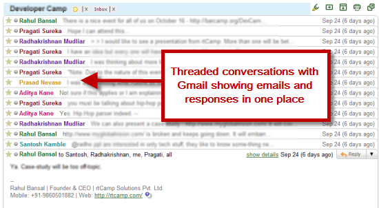 One major plus point for me with Gmail is it conversation mode when it comes to emails. The emails are like threaded conversations and ideal to discuss something with a group of friends and get all their responses in one single place like you can see in the image below.