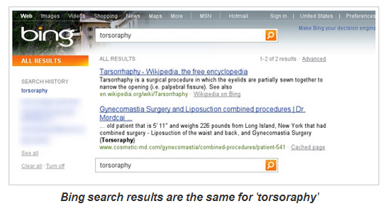 Google has accused Microsoft’s Bing search of copying their search results. The controversy came up thanks to Google’s search feature which offers corrections to wrong spellings of search queries. Google announced that back in the summer of 2010, they found that the search query ‘torsoraphy‘ when entered on Google search returned the correct spelling as ‘tarsorrhaphy‘.