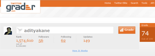 That’s interesting.. My twitter grade came out to be 59.. One thing that I liked, it gives suggestions to improve your twitter profile.. I had not included my bio till now (thought of doing so later while creating account, then forgot :)) and this tool pointed that out.. I think it is more useful for professional twitter profile.. for personal profiles its more of a fun activity..