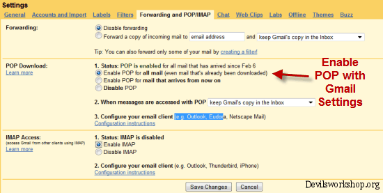 • Enable POP mail with at your desired Gmail account. (see image below)