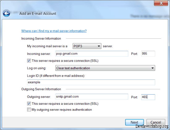 • Now at the next screen select POP3 Server and enter pop.gmail.com along with entering Port as 995 and select the check box for This server requires secure connection (SSL).