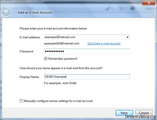 • Enter the Email address which is your Hotmail account along with the Password. You can choose to save the password and then the Display name. (see image below)