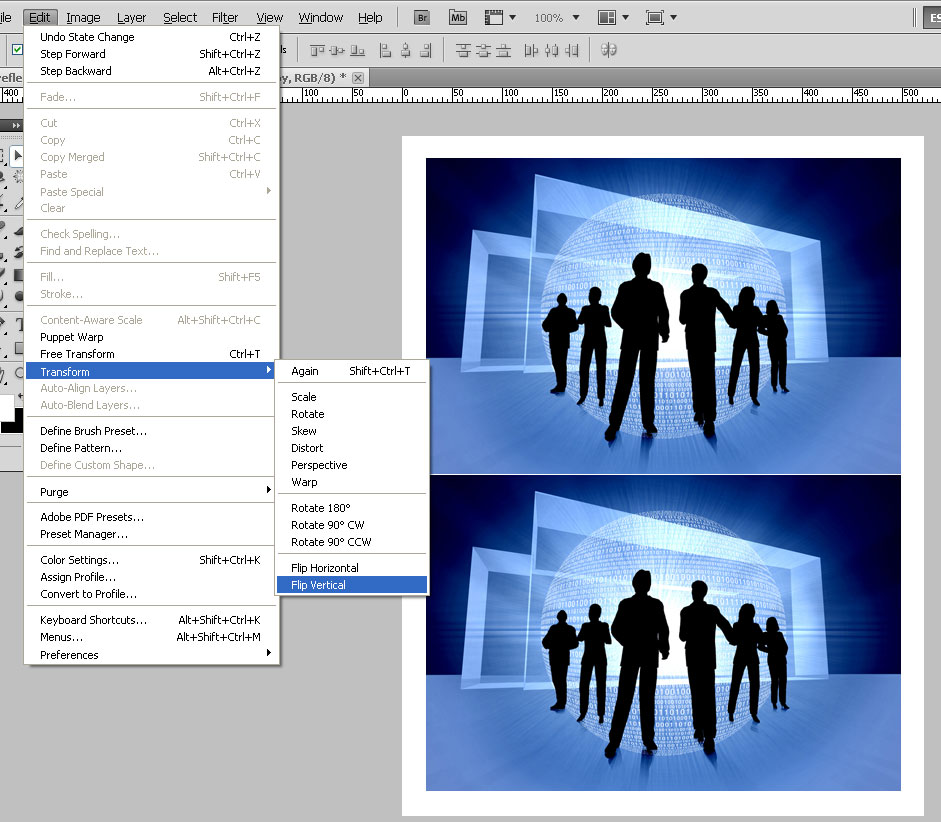 - Now we need to reverse the image. Select the image and go to Edit > Transform > Flip Vertical.