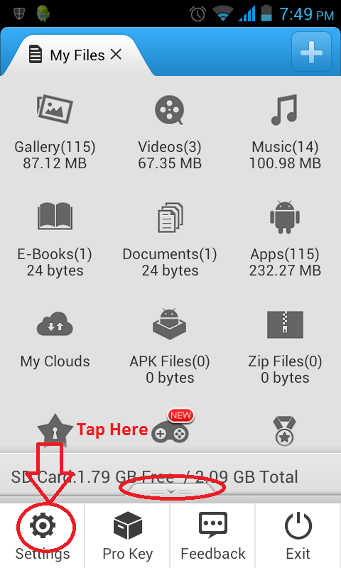 • Fire up the File Expert app. Just at the bottom of the home screen you will see a pull-up tab. Touch on it and you get few more options. Touch on ‘Settings’.