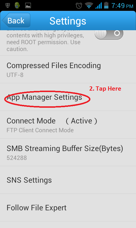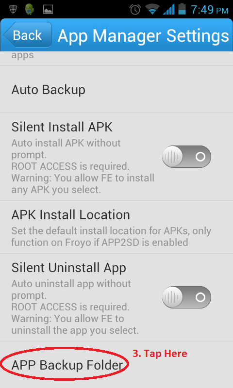 • In Settings, scroll down to ‘App Manager Settings’ and then touch on ‘App Backup Folder’
