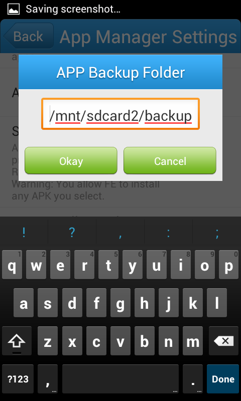 • It will have the pre-populated value as ‘mnt/sdcard/backup’. Edit the value to ‘mnt/sdcard2/backup’.
