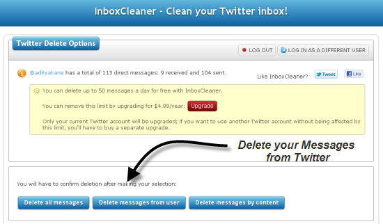 Just visit the InboxCleaner and login with your Twitter details. This takes us to a page with three options to delete messages. I could simply choose to Delete messages from a particular user or by content. In case you are not too picky a good option is to simply delete all messages.
