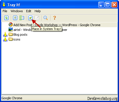 Another way to move the program to system tray is by directly selecting the program from the TrayIt application interface and then clicking on “Place in System Tray” button.