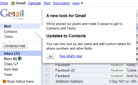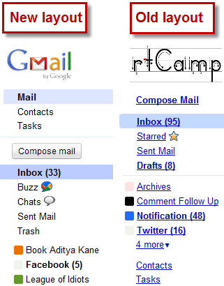 • The new layout bring about a change in focus. I guess many Gmail users might not have been aware of the Tasks features and also struggled a bit to find contacts. New layout makes a user plainly aware of Mail, Contacts and Tasks.