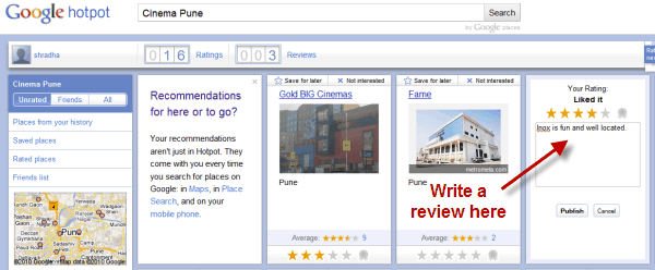 Google Hotpot gives you an interface with which you can rate, review and seek recommendations for local services like – Restaurants, Cinemas, Hospitals, etc.