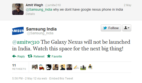 Samsung India has decided that they are not going to release Galaxy Nexus in India at all. They did not announce this through any official announcement but while replying to a tweet by Amit Wagh.