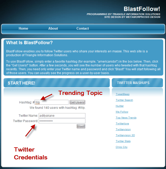 - Once you click on ‘Blast’ the web tool starts to automatically start following everyone who has used the hashtag in recent times.