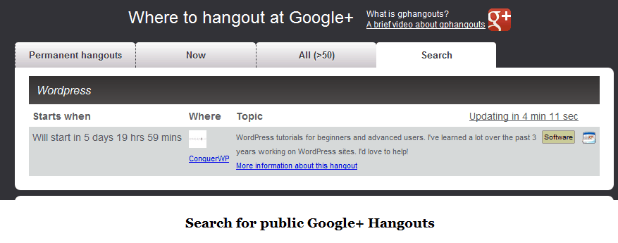 For instance I searched for WordPress related hangouts and straight away I got a link to a public Hangout.