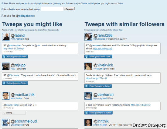 Google has released a tool which is still a beta product but very interesting and might be useful for people trying to dig into Twitter. What is does is allows you to search for interesting people on Twitter if you enter the Twitter ID of someone you are following and find interesting. This tool is called Follow Finder.