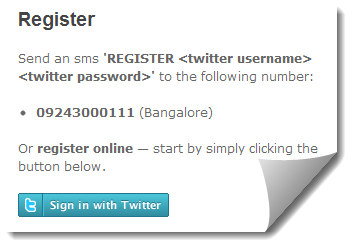 To start tweeting by SMS you need to register in SMStweet by sending a SMS as follows REGISTERto the following number 09243000111 or you can also register by visiting smstweet.in. Once you hit register button in the website you will be asked to provide your tweeter user name and password, further you need to authorize smstweet app.