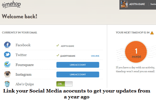 Timehop is an internet service that sends you email updates everyday with what you shared on Facebook, Twitter, Instagram and Four Square.