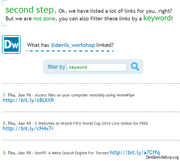 In the screen shot shown above, you can see the URLs tweeted by the Twitter user. You can also see the “filter by keyword” box. Enter the keyword inside the box and it will show the tweets containing that keyword. Obviously it’s a time saving process because searching for tweet containing keyword for any particular Twitter user is a time consuming process.