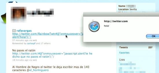 I am pretty sure Twitter will close up this security hole. But there are some things we can do avoid this sort of JavaScript Code on a link.