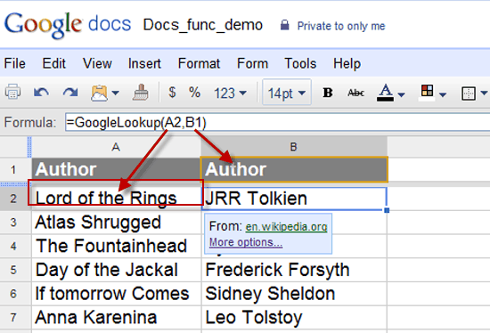 I came across a nice post on Google Blog about functions in spreadsheets which uses Google’s search power to lookup stuff online. For instance you write the list of your favorite movies and use Google to insert the name of the director next to it. All this is done thanks to a spreadsheets function called Googlelookup. š