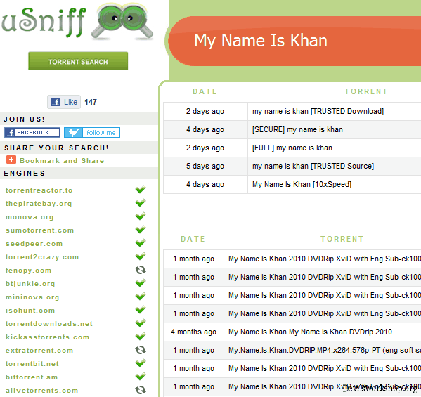 Usniff is a nice torrent meta search engine which can search from various torrents search engines sites and displays all the results quickly. It search from approxiamtely 16 torrents search engines such as thepiratebay, torrentreactor, monova, sumotorrent, bittorent, kickasstorrents and many more.